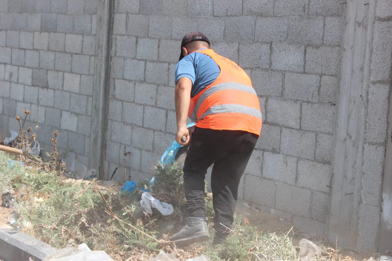 تستمر جهود بلدية النصيرات في تنظيف الشوارع الرئيسية وإزالة الأشواك والرمال