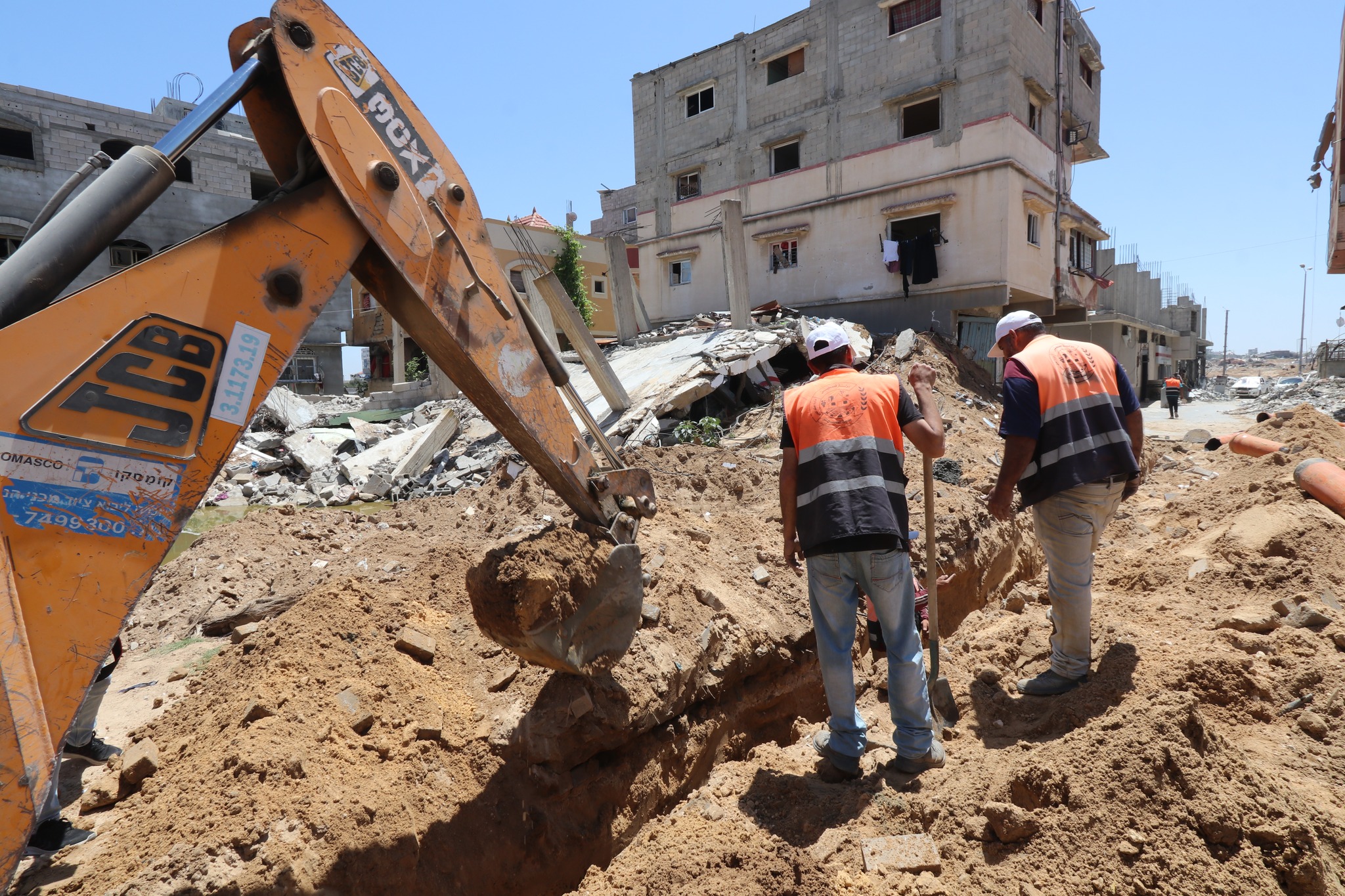 جانب من الجهود الميدانية المتواصلة التي تبذلها طواقم بلدية النصيرات بالتعاون مع مصلحة مياه بلديات الساحل في صيانة خطوط المياه والصرف الصحي