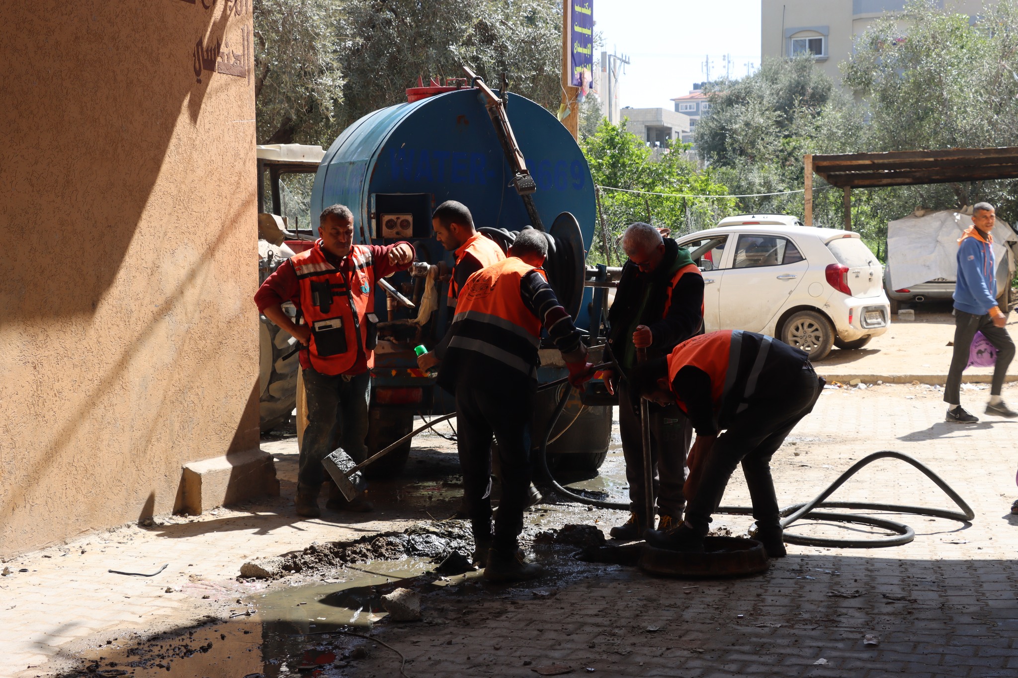 جانب من الجهود الميدانية المتواصلة التي تبذلها طواقم بلدية النصيرات في متابعة تسليك وتعزيل خطوط ومناهل