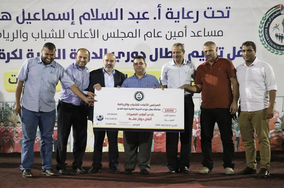 شارك رئيس بلدية النصيرات أ. إياد مغاري في حفل تكريم "نادي شباب أهلي النصيرات" بطل دوري الدرجة الثانية لكرة القدم لموسم 2021م (فرع الوسطى والجنوب)، الذي أقامه المجلس الأعلى للشباب والرياضة مساء أمس الأربعاء في استاد فلسطين الرياضي. وكان مساعد الأمين العام للمجلس الأعلى للشباب والرياضة أ. عبد السلام هنية، قام بتكريم بطل دوري الدرجة الثانية لكرة القدم لموسم 2021 عن فرع (الوسطى والجنوب)، نادي شباب أهلي النصيرات، ونادي خدمات جباليا عن فرع (غزة والشمال) وحصل كلا الناديين على مكافأة المجلس الأعلى بقيمة (2000) دولار. وجرى الحفل بحضور رئيس بلدية النصيرات أ. إياد مغاري، وعضو اتحاد كرة القدم د. وجدي جودة، ورئيس نادي خدمات جباليا اللواء جمال الجراح، ورئيس نادي أهلي النصيرات د. محمد أبو عون.