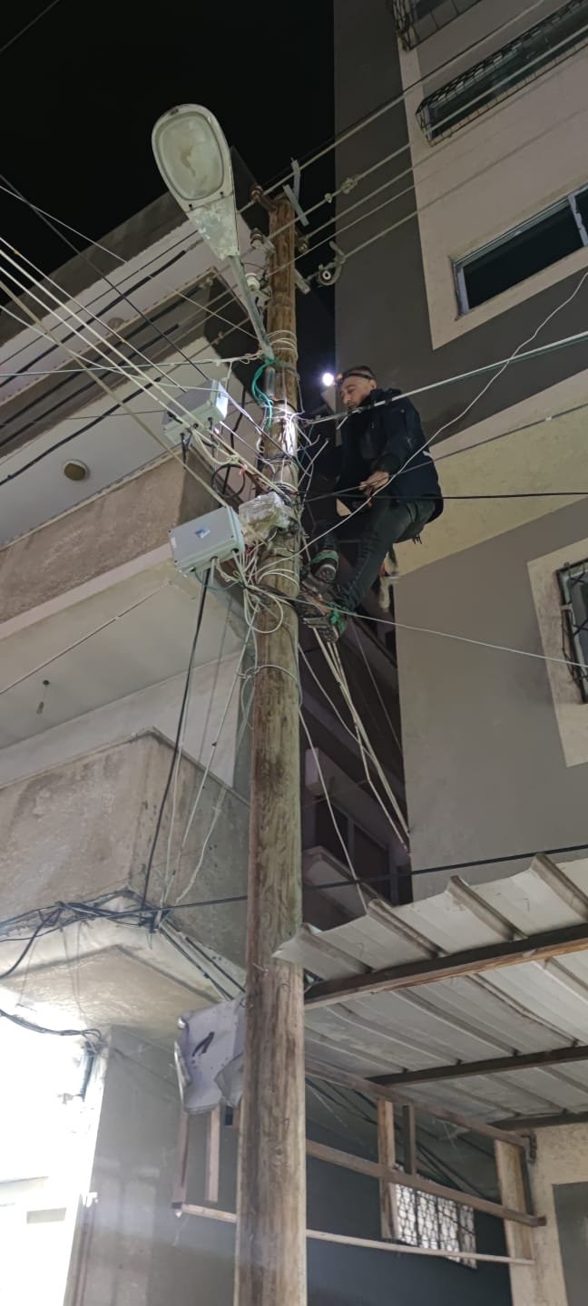 العنوان : طاقم الكهرباء في بلدية النصيرات خلال تنفيذه لأعمال صيانة لشبكة الإنارة وتركيب كشافات