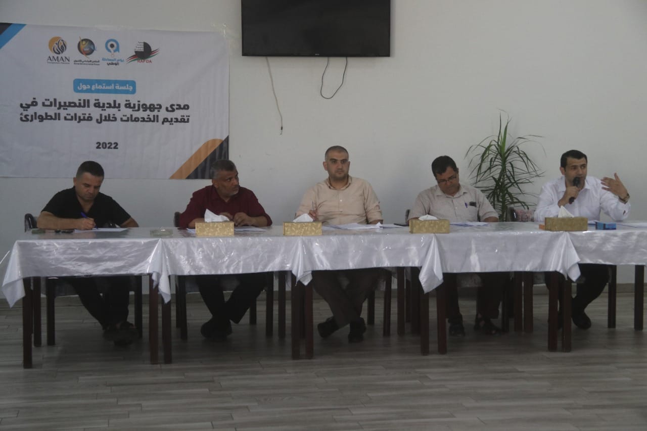 شاركت بلدية النصيرات ممثلة بنائب رئيس البلدية أ. نبيل الصالحي، ومدير دائرة المشاريع م. ابراهيم ابو سلطان، ومدير دائرة المياه والصرف الصحي م. نعيم قوش، ومدير دائرة الصحة والبيئة م. علي الهباش، في جلسة الاستماع التي عقدتها جمعية رؤيا لتنمية القدرات حول مدى جهوزية بلدية النصيرات لتقديم الخدمات خلال فترة الطوارئ، بمشاركة عدد من الوجهاء والمخاتير والمجتمع المحلي. وأكد نائب رئيس بلدية النصيرات أ. نبيل الصالحي على أن البلدية تتبع بشكل كبير مبدأ النزاهة والشفافية وتحرص على مشاركة المجتمع المحلي في صنع القرار. وأشار إلى أنه يتم معالجة مواطن الخلل أولا بأول ومتابعة شكاوى المواطنين، منوها إلى أن طواقم البلدية الميدانية حافظت على تقديم الخدمات الأساسية للسكان في ظل الأزمات والحروب.