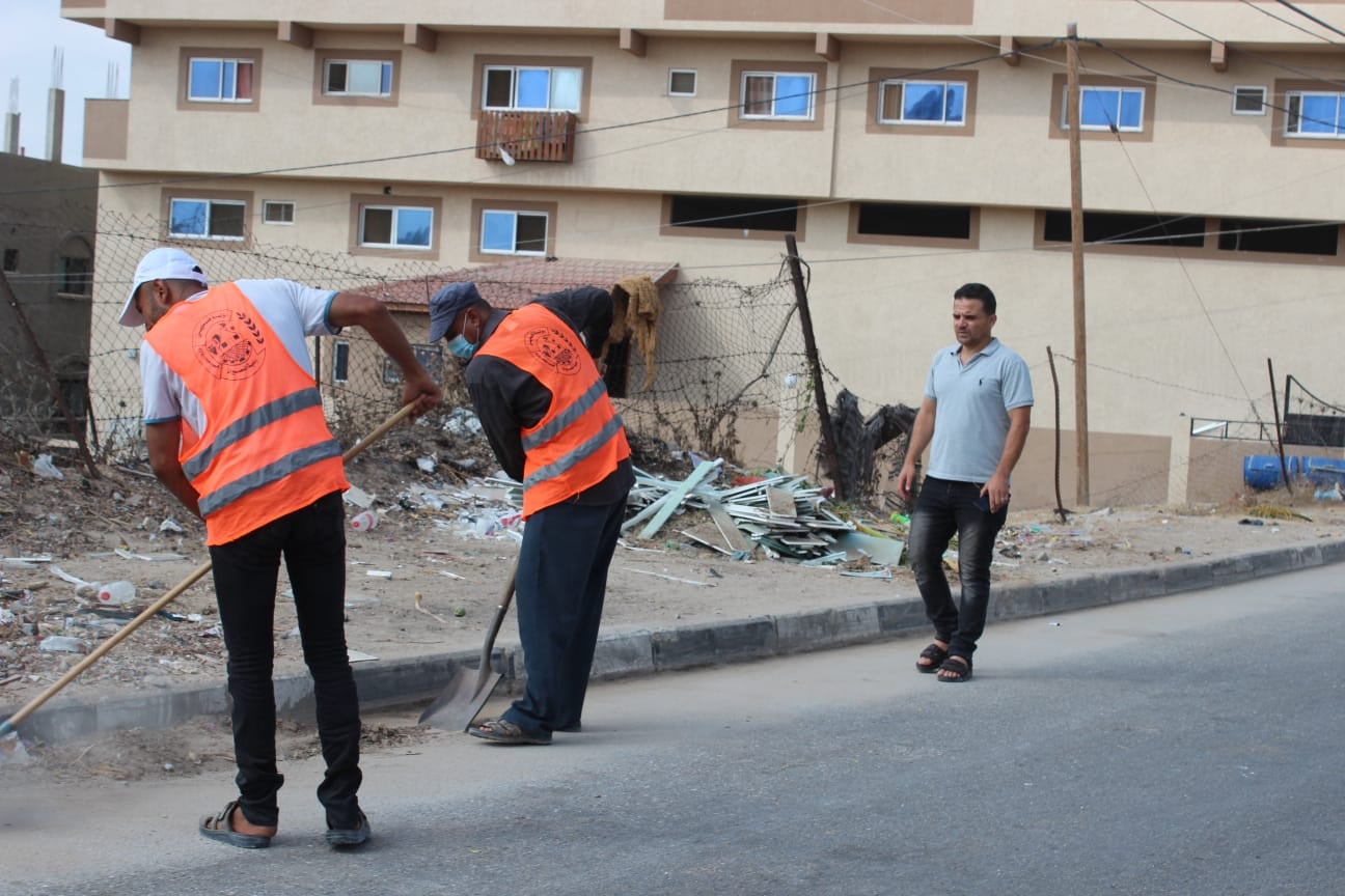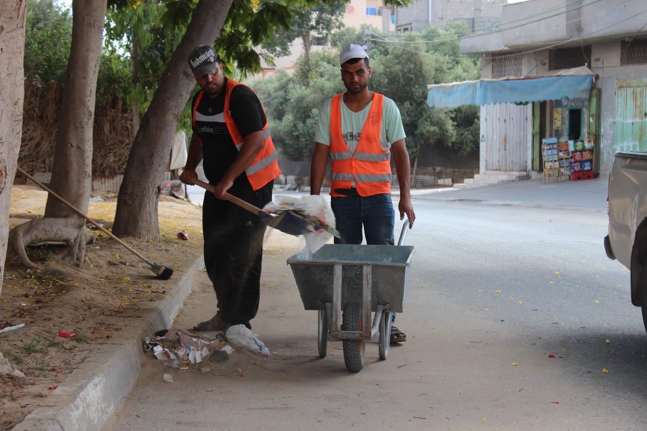 تستمر جهود بلدية النصيرات في تنظيف الشوارع الرئيسية وإزالة الأشواك والرمال