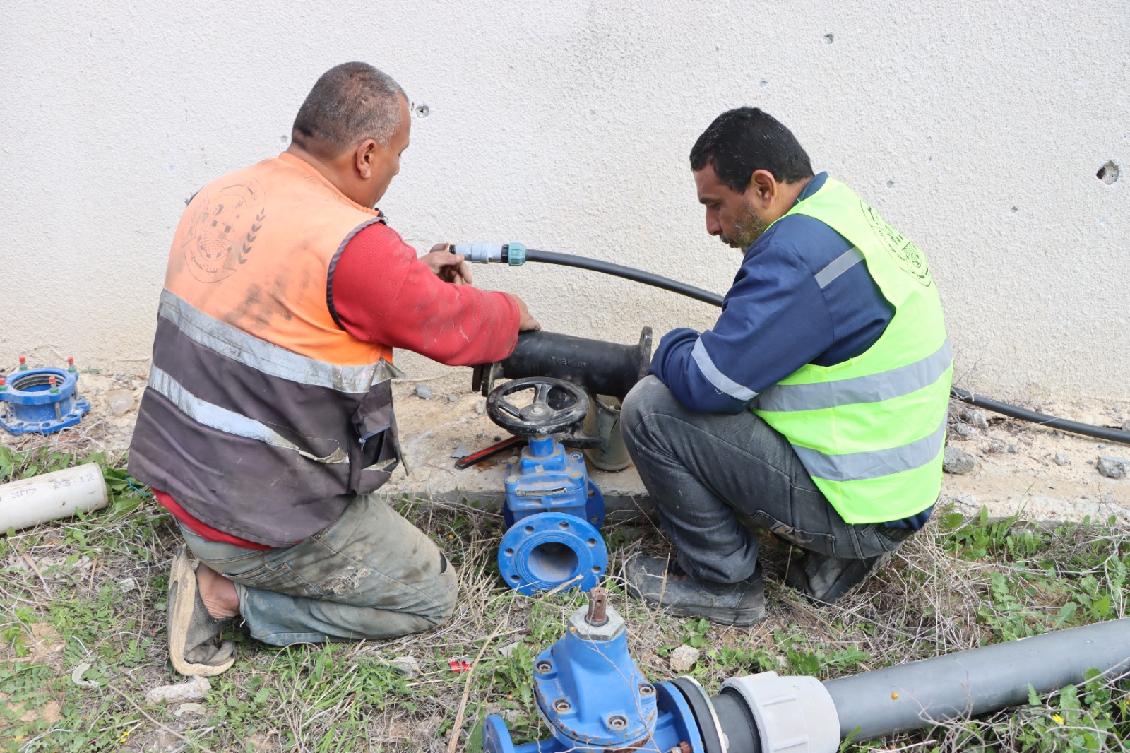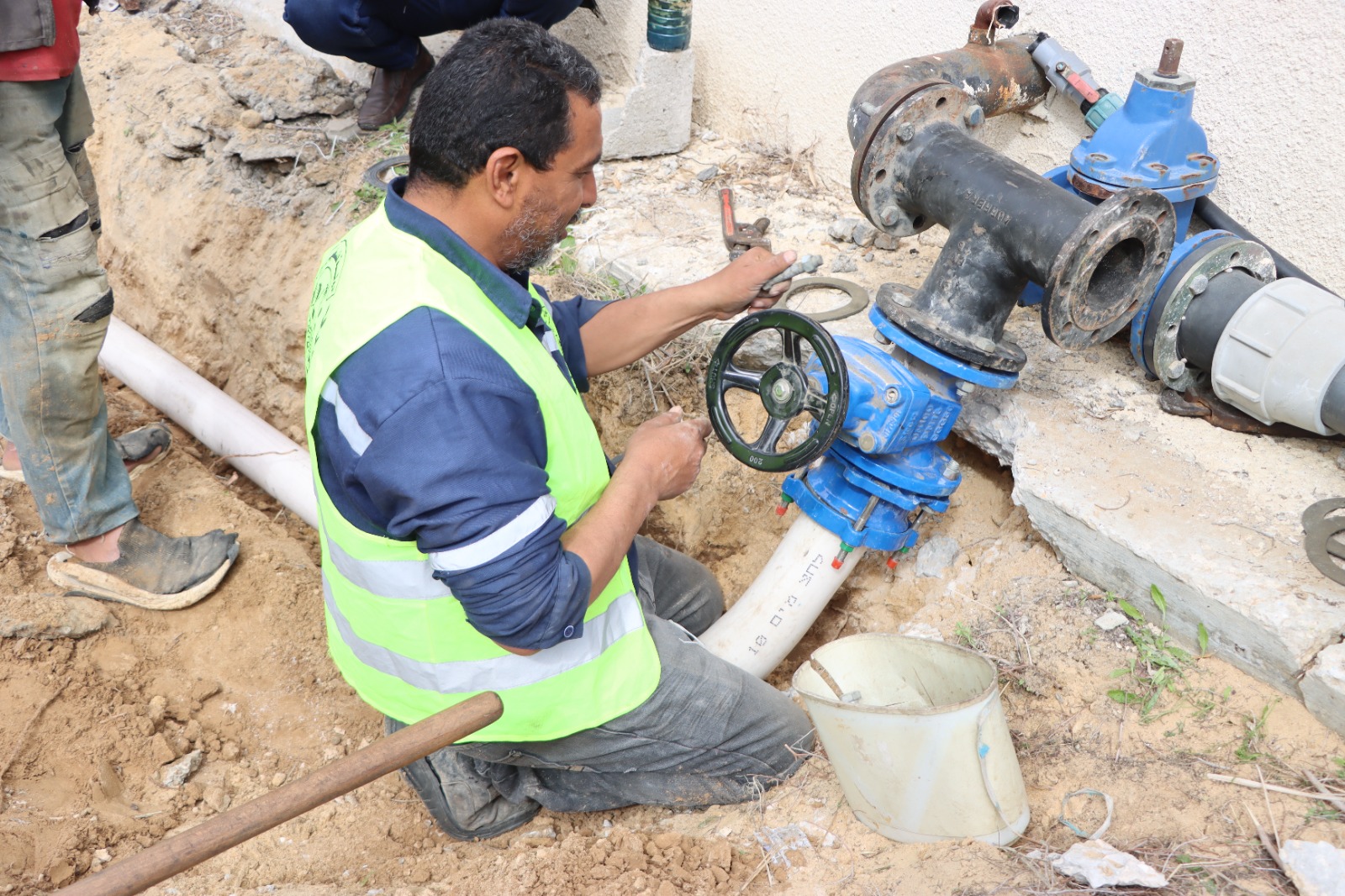 طاقم بلدية النصيرات خلال قيامه بترميم وصيانة بئر مياه يقع في منطقة شرق النصيرات