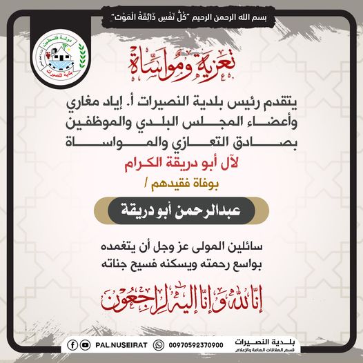 حقوق الطباعه والنشر © 2021 بلدية النصيرات تصميم وبرمجة : عبد الكريم عاصم مشتهى 592782897 972+