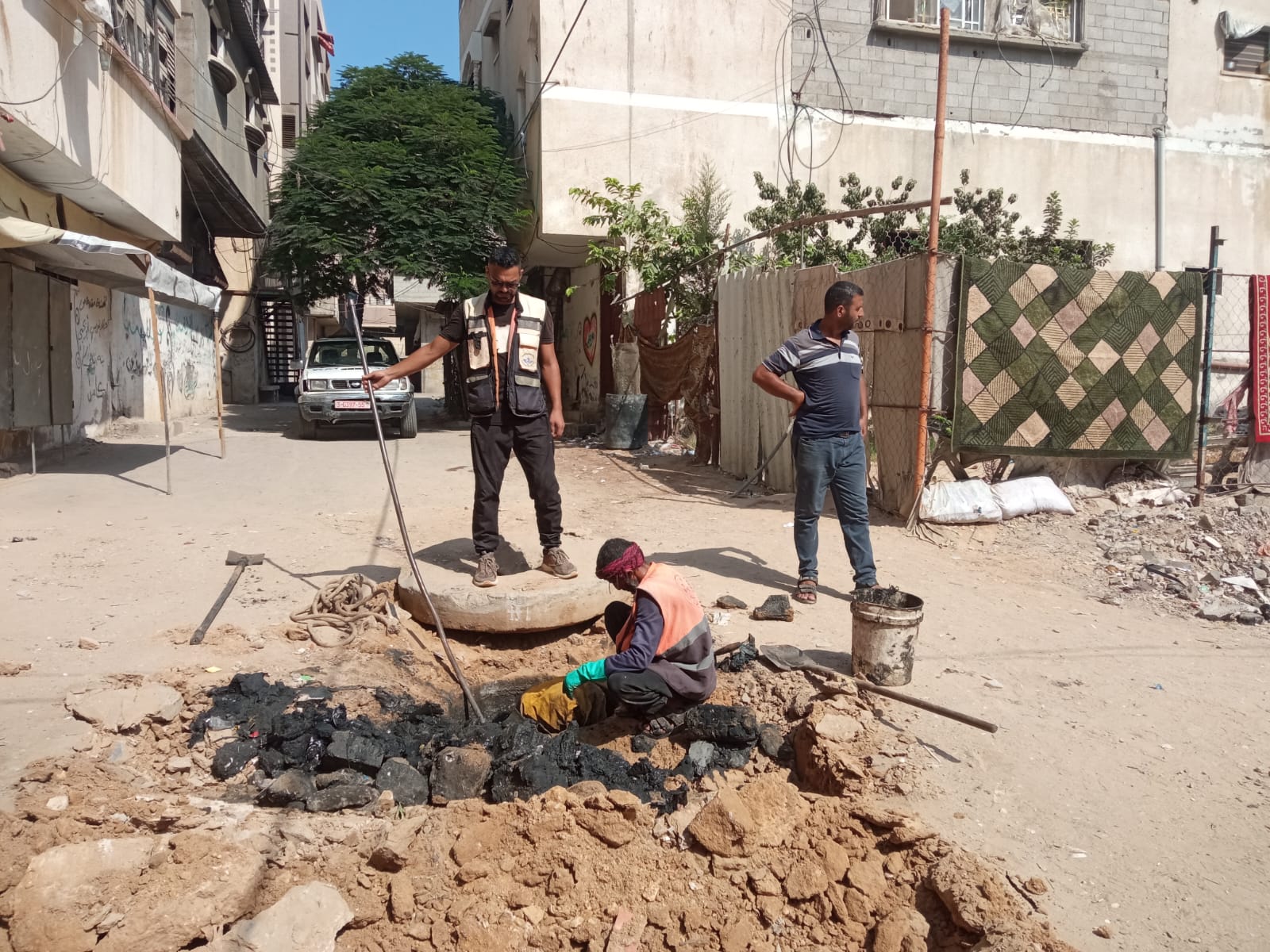 العنوان : جهود ميدانية متواصلة يبذلها طاقم الصرف الصحي في بلدية النصيرات لمتابعة ومعالجة شكاوى الصرف الصحي